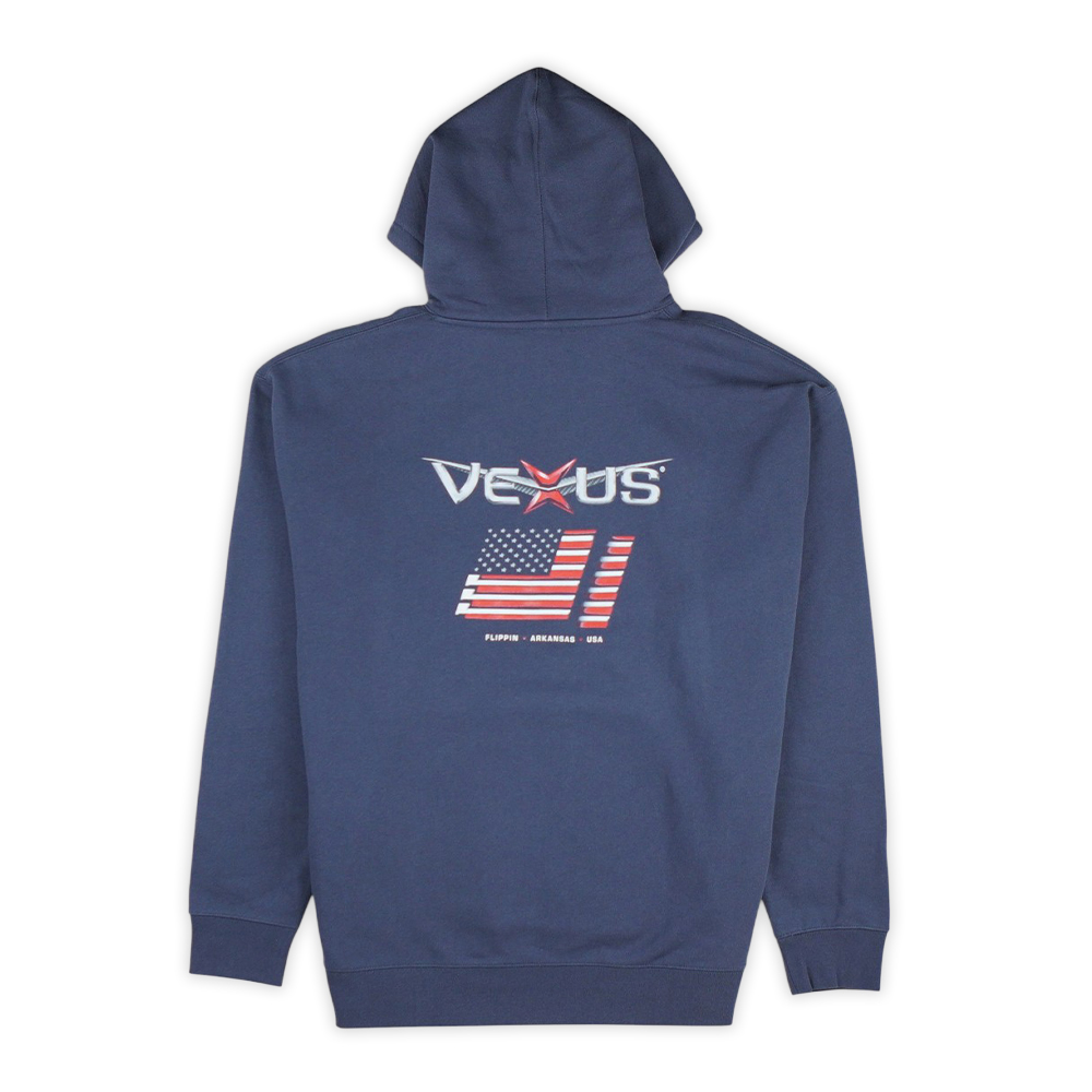 Stay warm and show your pride with the Vexus Boats Patriot Hoodie. This premium navy blue hoodie features a bold back graphic with the Vexus logo and American flag design, celebrating American craftsmanship and performance. The front includes a minimalist Vexus logo and a convenient kangaroo pocket for comfort and functionality. Made from soft, durable fabric, this hoodie is perfect for cool days on the water or casual wear year-round.
